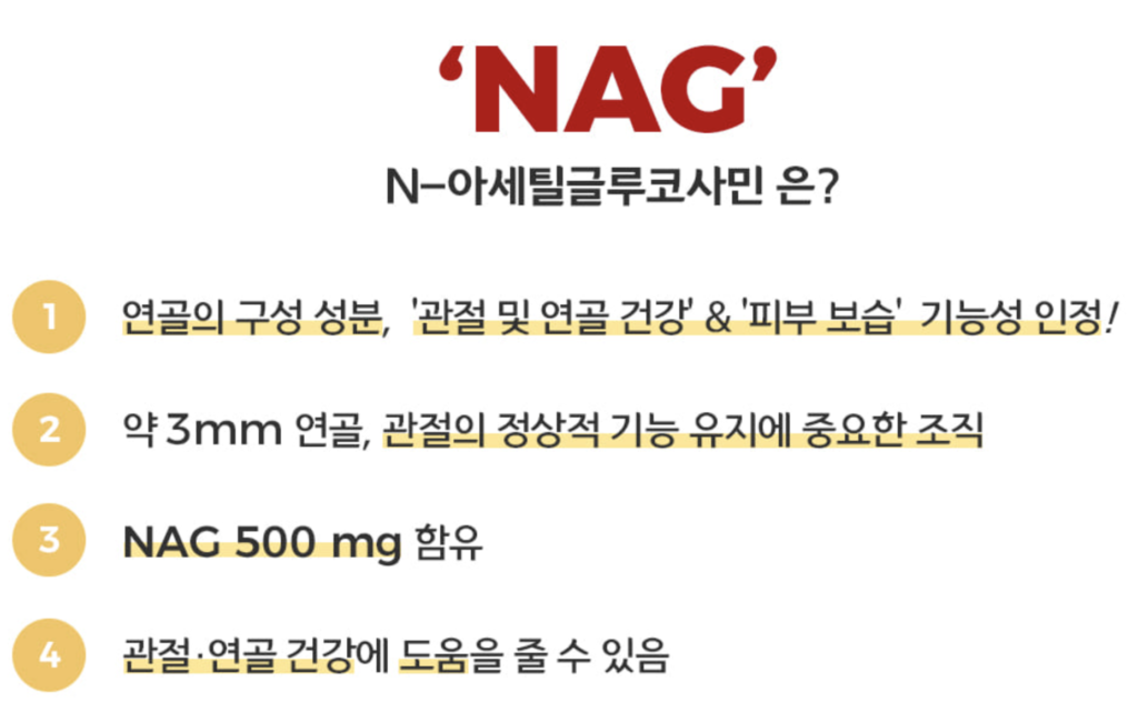 NAG는 관절의 윤활액 역할을 하며 연골 건강에 도움을 줍니다. 진관진에는 NAG 500mg를 함유하고 있습니다.