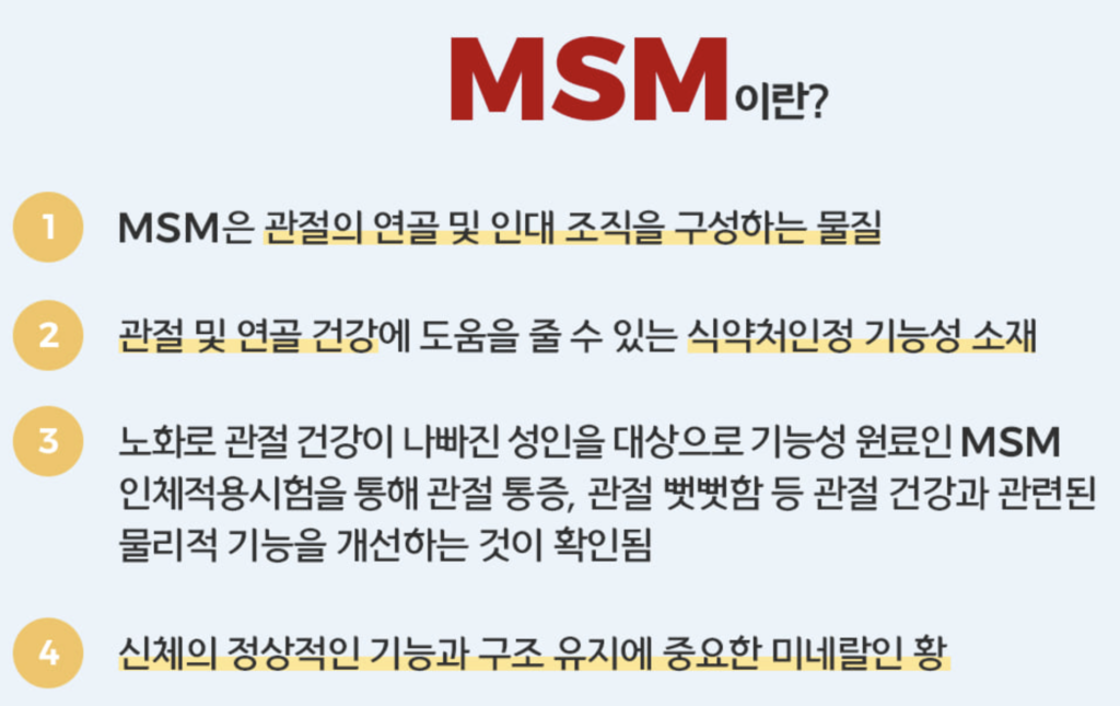 MSM은 식이유황(먹을 수 있는)유황을 뜻하며 머리카락, 손톱, 발톱, 피부, 근육, 연골 등에 다양하게 분포합니다.