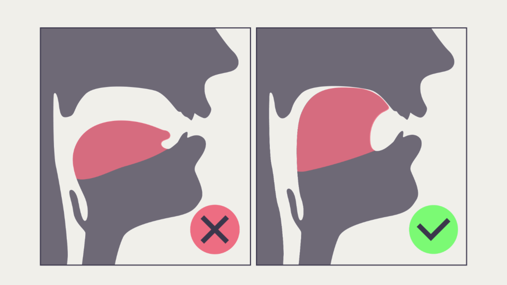 위 예시 사진에서 볼 수 있듯이, 혀를 오른쪽 위와 같은 방식으로 위치하는 습관을 들이는 것이 좋습니다. 혀를 윗니 뒤와 천장에 붙이면 코로 숨을 쉬는 것을 곧바로 느낄 수 있습니다.